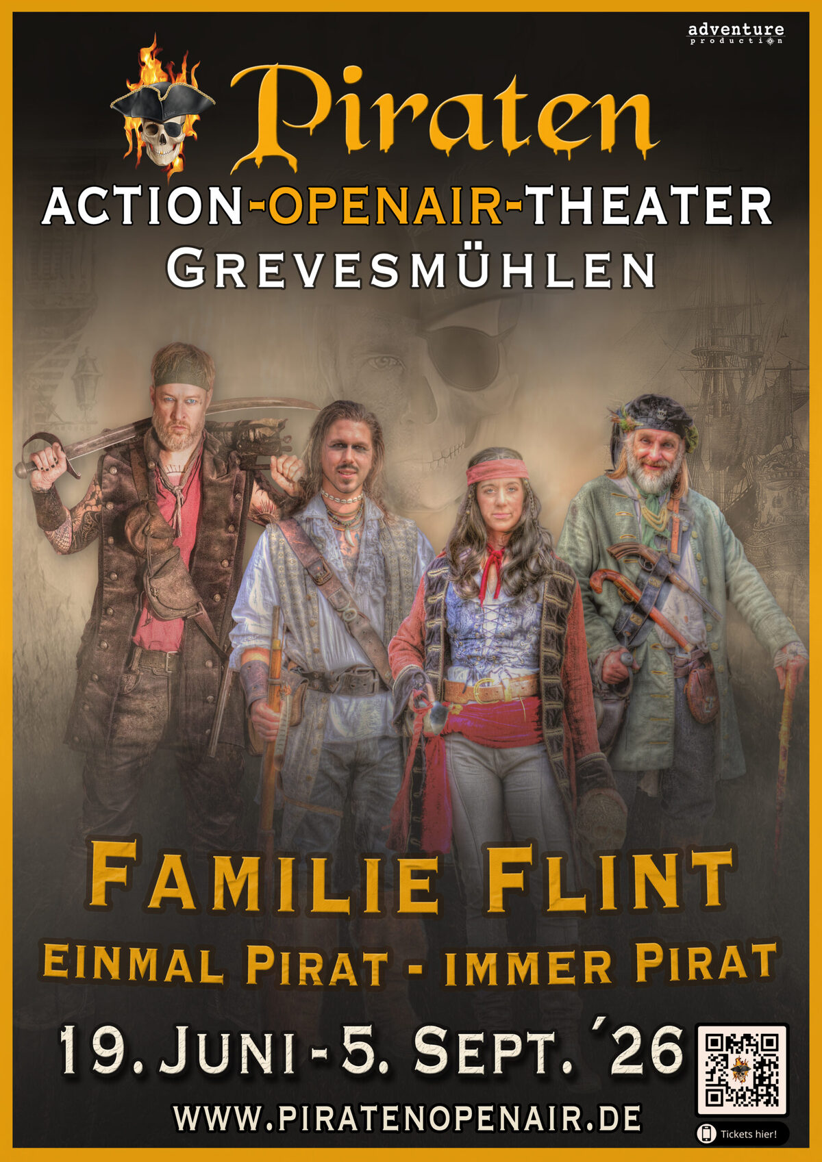Im Mittelpunkt steht die Familie Flint, die zeigt, dass das Leben als Pirat nicht nur gefährlich, sondern auch voller Zusammenhalt und Abenteuer ist. Mit beeindruckenden Kulissen, lauten Kanonenschüssen und einer packenden Handlung wird das Publikum mitten in die Welt der Freibeuter entführt. Das Piraten-Action-Open-Air ist damit ein besonderes Erlebnis für die ganze Familie und ein Highlight des Sommers 2026.